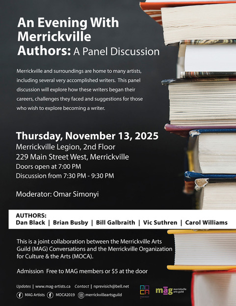 The Merrickville Arts Guild (MAG) is delighted to partner with the Merrickville Organization for Culture & the Arts (MOCA) to host a special edition of Conversations on Thursday, November 13, 2025 at the Merrickville Legion, 2nd Floor.